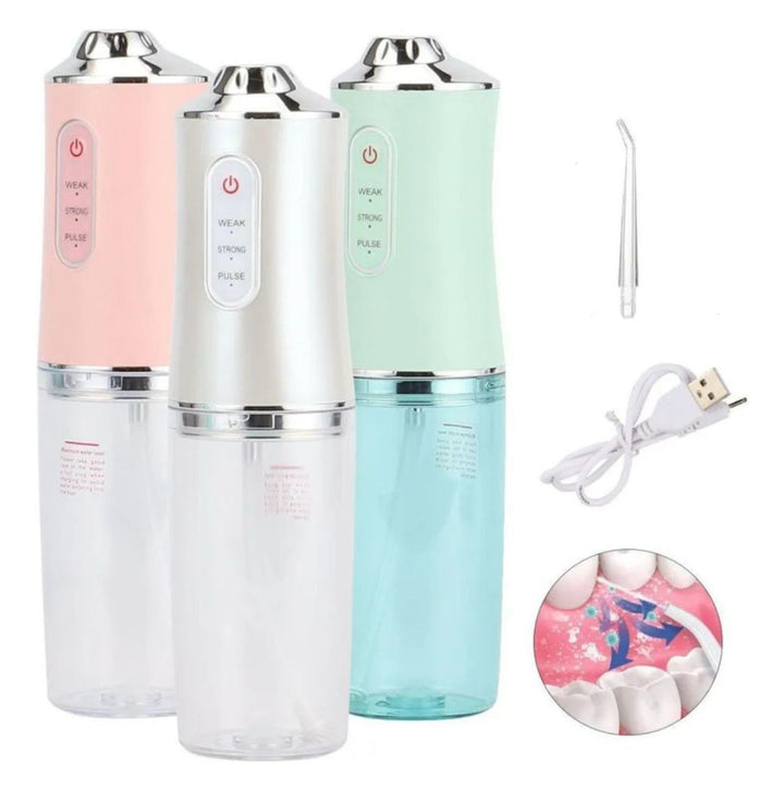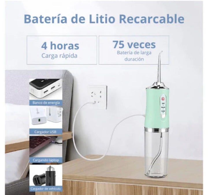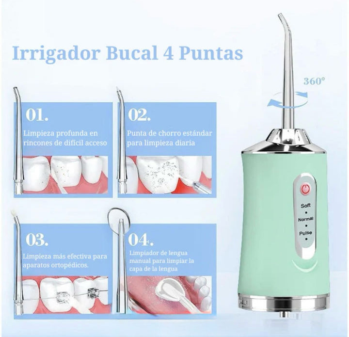 profesional 4 boquillas ❤️ portátil , recargable . Dispositivo de limpieza dental que ayuda a reducir eficazmente los residuos alimentos , los gérmenes y la suciedad mejorando la condición oral. Es especialmente útil para personas con ortodoncia o retenedores 🌟 cuenta con 3 modos de uso: suave , fuerte y pulso . Su uso regular 2-3 veces al día puede ayudar a prevenir problemas como caries , sangrados e encías entre otros. Función de apagado automático.